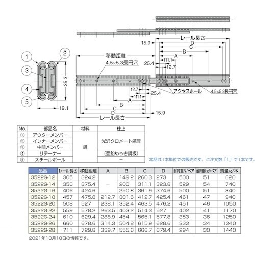 スガツネ工業 SUGATSUNE (190110008)3522G−22スライドレール 3522G22 1本 A02W-5750