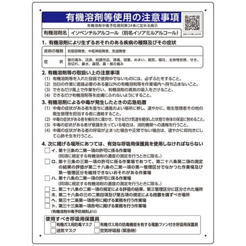 表示内容:有機溶剤等使用の注意事項 イソペンチルアルコール | 取付仕様:ビス止め、両面テープ止め | 縦(mm):600 | 横(mm):450 |…