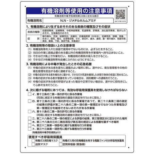 表示内容:有機溶剤等使用の注意事項 N,N−ジメチルホルムアミド | 取付仕様:ビス止め、両面テープ止め | 縦(mm):600 | 横(mm):45…