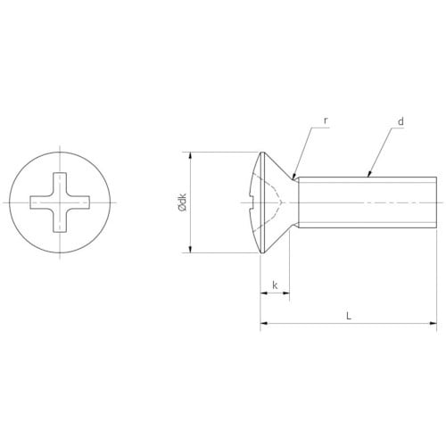 十字穴付きの丸皿頭小ねじです。頭部が少し出ても安全性を損ねず、それが装飾的なアクセントにもなります。部材に座ぐり加工が必要です。ボルトに比べ小さな部材の一般的な締結に。 |