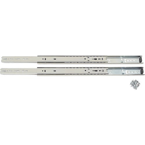 3/4スライドの2段引スライドレールです。レバー操作でインナーメンバーを取り外せます。レールを全閉にした時、その状態を簡易的に保持します。全開時、全閉時の金属音を緩和する消音機構付です。 |