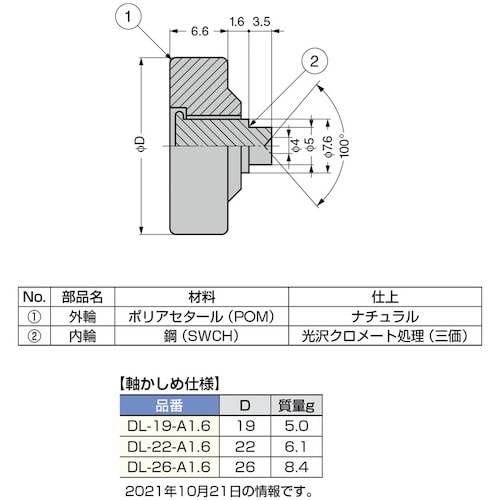 外径(mm):19 | その他仕様:RoHS対応品 | その他仕様:外周フラットタイプ | その他仕様:軸かしめ仕様 | 外輪:ポリアセタール(POM…