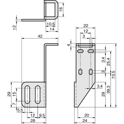 アルミフレームの溝を利用して光電センサを取り付けるためのブラケットです。アズビル社HP7シリーズ、オプテックスです。 |