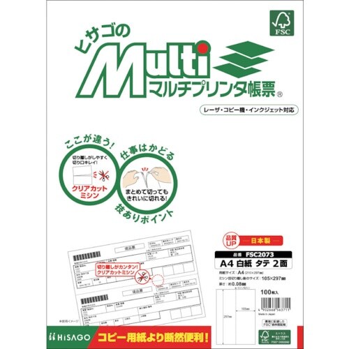 FSC(R)認証材を使用したプリンタを選ばないマルチタイプの汎用帳票用紙です。無地タイプなので使いやすい設計で帳票を印刷できます。 |