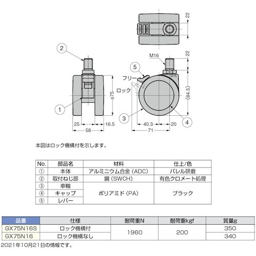 スガツネ工業 SUGATSUNE (200133219)GX75N16キャスター GX75N16 1個 A032-0853