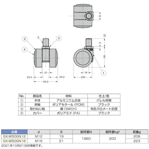 スガツネ工業 SUGATSUNE (200130029)GX−W50GN16キャスター GXW50GN16 1個 A032-0854