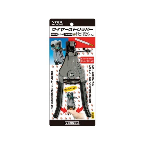 プロ用工具、決定版。1回の操作で完璧にすばやく被覆をはぎとることができる。テレビ・ラジオその他の電気器具、電気工事、自動車の電気回路、電信電話機の配線など多用途に使える。ストリップゲージ付。 |