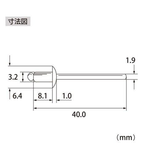適合ノーズピース:3.2 | 下穴径(mm):φ3.3〜3.4 | 適正かしめ板厚(mm):MIN3.2〜MAX4.8 | 寸法(mm):L8.1×D…