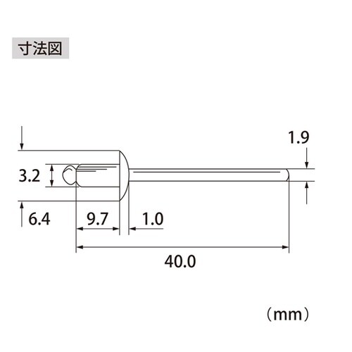 適合ノーズピース:3.2 | 下穴径(mm):φ3.3〜3.4 | 適正かしめ板厚(mm):MIN4.8〜MAX6.4 | 寸法(mm):L9.7×D…
