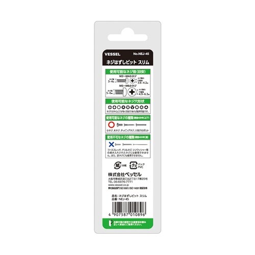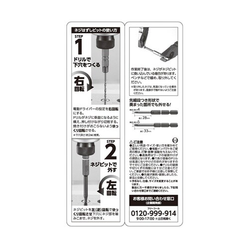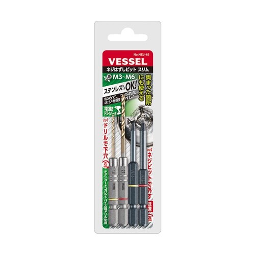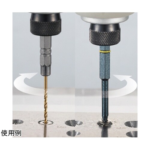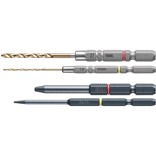 奥まった箇所にも使える先端スリム形状。チタンコートのコバルトハイス鋼ドリルでステンレスネジ対応。ドリルビットで下穴を作ってネジビットで外す。 |