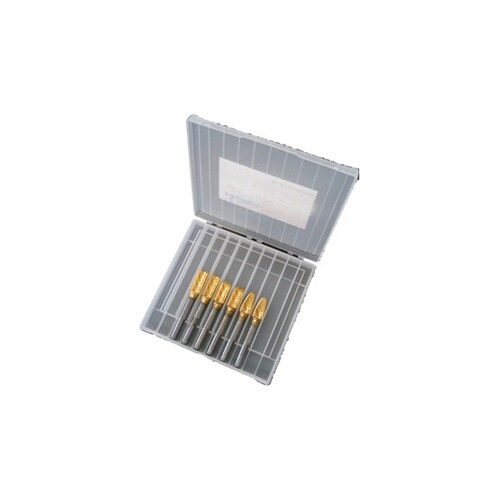 チタンコーティングのスーパー超硬バーをセット品にしました。チタンコーティング処理により表面硬度が高く、バー寿命が長く、切粉のハケが良くなります。