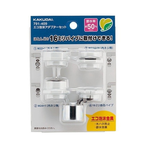M24×1.0内ネジ、M22×1.0外ネジ、W23山20内ネジ、先端にふくらみのある外径16mmのパイプをW22山20ネジへ変換できるアダプターセットです。 |