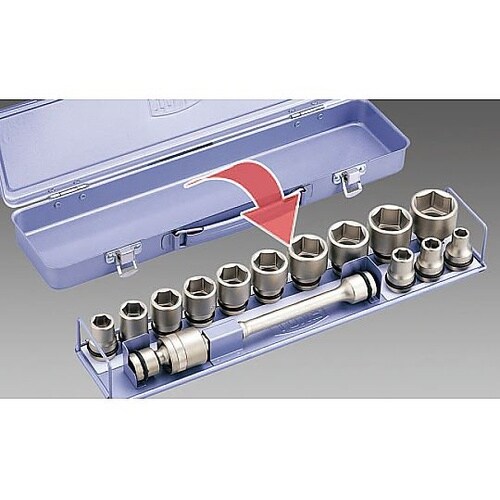 ケース付き無電解メッキ仕上ピン・Oリングのついたインパクト用ソケットをそのまま収納可能個々の製品が決められた位置に固定されるので、整理が容易です。 |