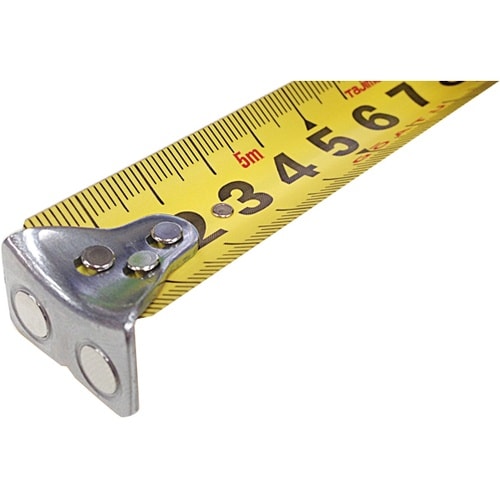 目盛仕様:メートル目盛、JIS1級、両面目盛 | テープ幅:25mm | テープ長さ:5m | テープ:両面剛厚イエローテープ | 表示:ヨンゴーゴー…