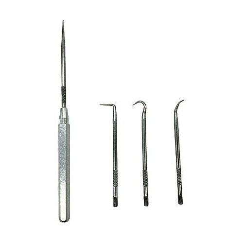 差し替え式のピックツールセットです。作業に合わせた4タイプの先端形状です。ハンドル底部には強力なマグネット付きです。耐熱処理が施されております。コネクター端子、ストッパーの脱着に。 |