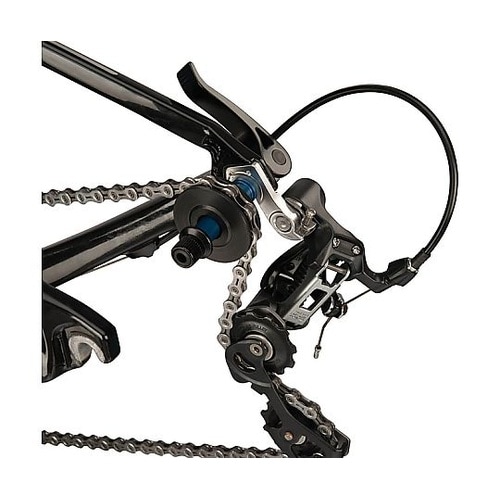 チェーンなどのドライブトレインの洗浄やメンテナンス、後輪を外しての自転車の輸送時にチェーンが不用意に遊ばないようにしておく便利なダミーハブ。 |