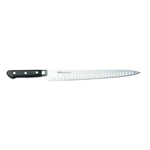 切れ味が冴え、しかもサビにくいです。モリブデンとバナジウムの入ったハイカーボンの高級ステンレス・モリブデン鋼を使用し、ハイレベルの技術を駆使した理想の洋包丁です。刃身と一体のツバが衛生的です。 |