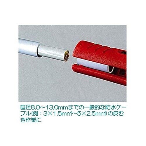 コンジット線、配電線にも使用できます。二重構造のボディー、折り合わせタイプのストリッパーです。オープンスプリングにより、口を開いた状態が維持されます。 |