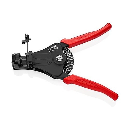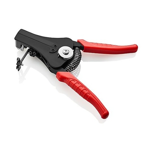 ストリッピング中、ワイヤーは、ジョウで保持されています。長さ止めがあるので、一定の長さでストリッピングできます。スプリングがストリッパーを開始位置へ戻します。刃先にワイヤーカッターが付いています。 |