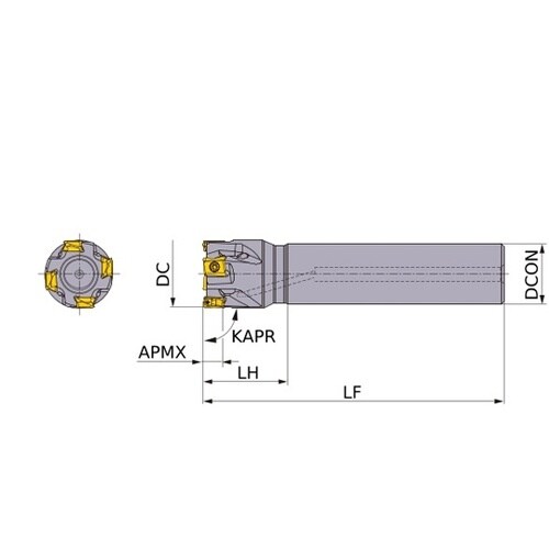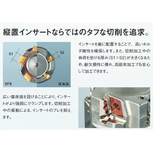 インサートを縦に配置することで、高いホルダ剛性を確保。ランピング加工やヘリカル加工時にインサートの付け替えをすることなく対応可能。 |