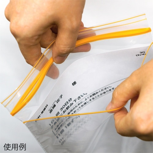 片面に薬情などを入れられるポケットが付いた便利なチャック付袋です。残薬を入れたまま患者様に持って来て頂ければ、残薬チェックにも活用できます。 |