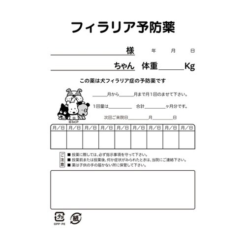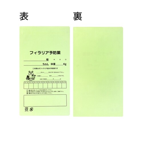 可愛いタマの絵柄がワンポントで入った、密封性に優れたフィラリア予防薬用のチャック付薬袋です。ボールペンで記入したり、印鑑を押すことも可能です。 |