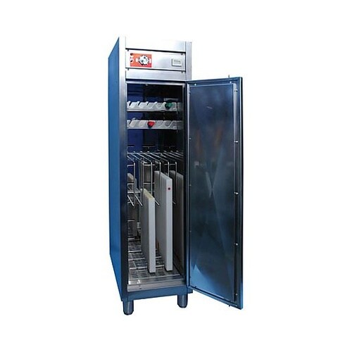 加熱処理(80℃5分・85℃1分)に対応する熱風タイプの庖丁まな板殺菌庫です。収納まな板は耐熱用で厚さ30mmのものをご使用下さい。 |