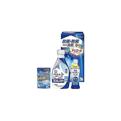 アリエール抗菌除菌ギフト抗菌洗剤アリエールと、少量でたくさん洗える濃縮タイプの食器洗剤除菌ジェル、室内干しのイヤなニオイを防ぎ、ふっくら柔らかく仕上がる抗菌・消臭ソフターのギフトです。