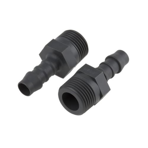 ストレートコネクタこれらのテーパーねじコネクタには片方のエンドにテーパーねじ、もう片方のエンドにプッシュオンホースコネクタが備わっています。 プッシュオンコネクタのリブでホースを確実に固定します。 |
