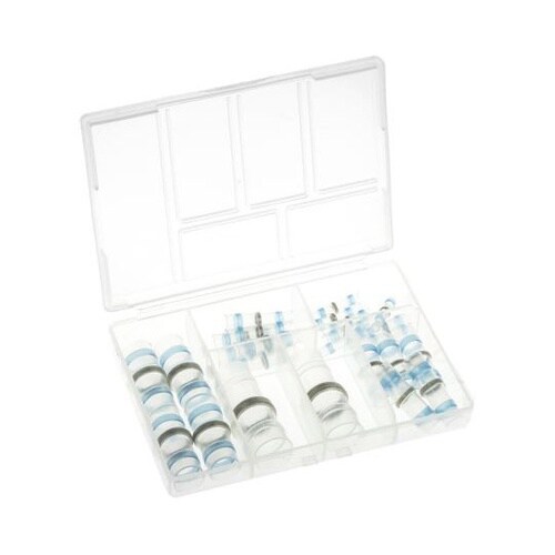 RS Proはんだスリーブキット各種の熱収縮可能スリーブが25個入ったキットは、ストレインリリーフ、絶縁、耐湿性を備え、環境被害から終端を保護します。 |