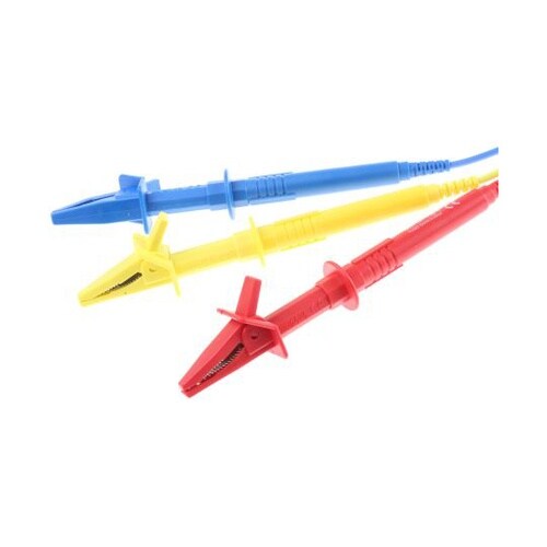 3相テストリード、600 V CAT III伸縮可能シュラウドプラグの付いた青、黄、赤のリード 3相電圧又は導通測定 プローブの定格は600 V CAT III。 |