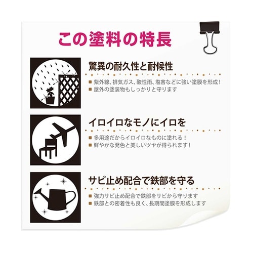 高耐久アクリル・シリコン樹脂配合だから紫外線・排ガス・雪・酸性雨など外敵から建物を守り、長期間風合い・ツヤを保ちます。 |