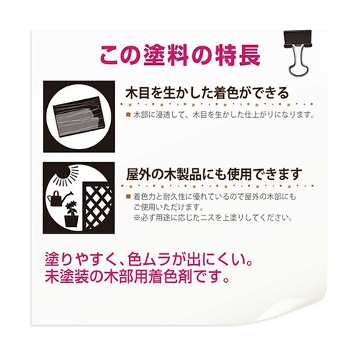 木目をいかした、鮮やかな着色仕上げができます。着色力と耐久性に優れているので屋外でも使用できます。着色力に優れた油性タイプ。 |