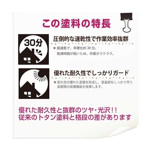 高耐久アクリル・シリコン樹脂配合だから紫外線・排ガス・雪・酸性雨など外敵から屋根を守り、長期間風合い・ツヤを保ちます。たれにくく塗りやすい超速乾型油性塗料だから作業性が抜群です。 |