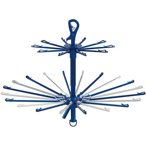パラソルハンガー特有の、上部にできるデッドスペースを有効利用できる2段式です。32cm幅のタオルがまっすぐに干せるロングアーム20本と、靴下などの小物が干せるミニアーム10本掛です。 |