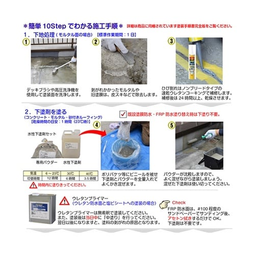 ウレタン防水に匹敵する防水性能です。トップコートにより遮熱効果を発揮します。ほとんどの防水下地に対応できます。1液で使いやすく、中毛ローラーで簡単に施工ができます。 |