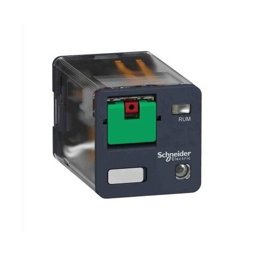 Schneider Electric 製品の Zelio RUM は、ベースにユニバーサルプラグインリレー、コンタクトをテストするためのスプリングリターンロック可能テストボタンです。 |