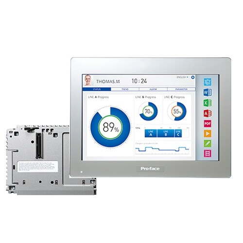 SP5000シリーズは操作パネルの表示器として採用できるインターフェイス端末です。2つのイーサネットポートにより、生産現場とオフィスをセグメント化して安全にネットワークにつなぎます。 |