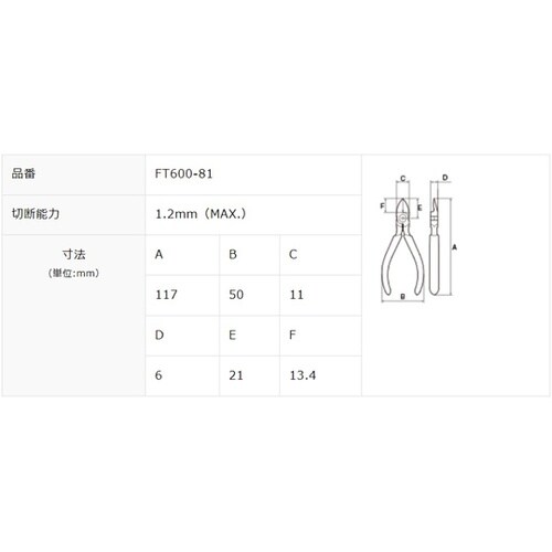 切断能力:1.2mm(MAX.) | 寸法:117(A)×50(B)×11(C)×6(D)×21(E)×13.4(F)mm | 単位:1個