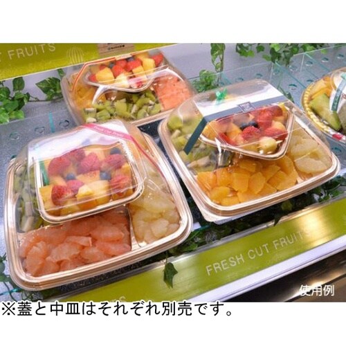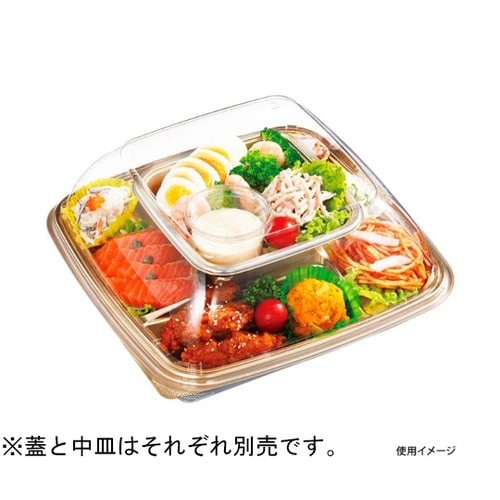 ドーム状の蓋と中皿(別売)でボリューム感ある盛付が可能なオードブル容器。中皿下の中央ポケットは保冷剤やソース・ディップ類を入れることができます。 |