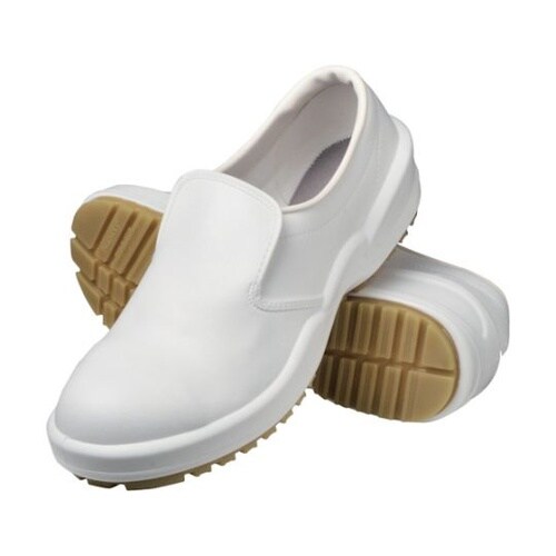 水・油の上で非常に滑りにくい厨房靴です。樹脂製先芯入りの安全タイプです。アーチサポートで疲れた足を支えます。ウレタン製のミッドソールで持続的なクッション性があります。食品工場用。 |