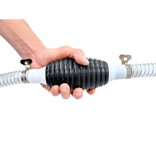 サイフォンの原理を利用し、排水ができます。電気不要・放置しているだけで排水が完了します。水中ポンプを使わず段差スラブの排水作業が行えます。持ち運びが楽になります。 |