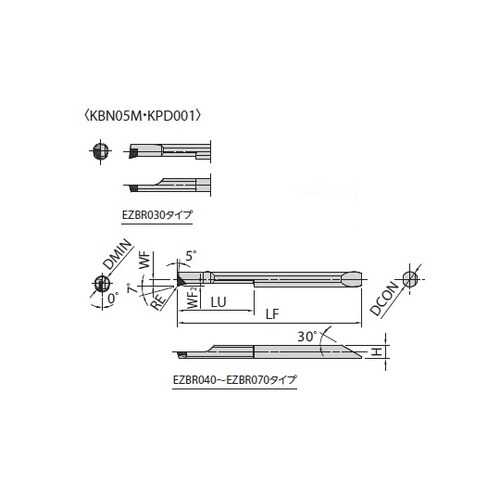 ブレーカなし(ダイヤ・CBN・アルミ加工用)非鉄金属加工用。内径加工。止まり穴への加工は、推奨しません。前切れ刃がワーク中心を超えた状態で加工すると欠損する場合があります。 |