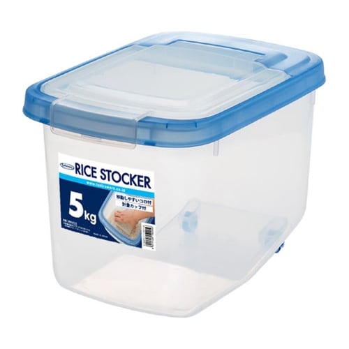 シンク下収納や戸棚の中に置場を想定したコスパに優れた5kg入る米びつ奥にコロ付きなので、手前を持ち上げて引き出せます。無洗米も計量できる目盛付きの底まですくい易い計量カップが付いています。 |