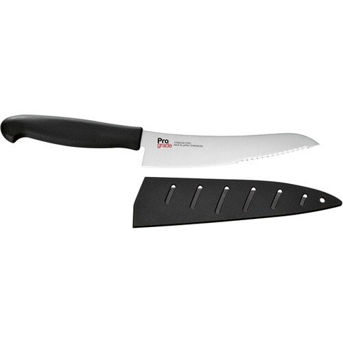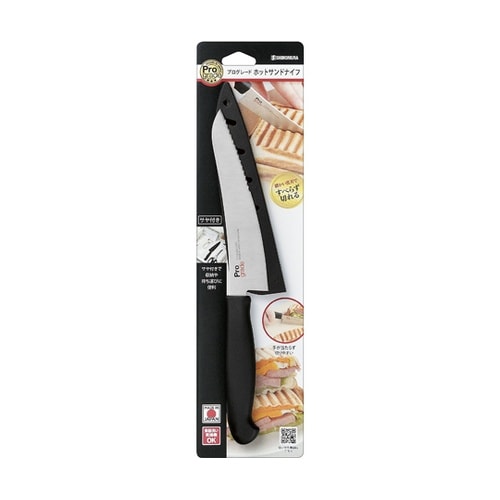 波刃とストレート刃で多用途に使える万能包丁。先端は食材に鋭く切り込む波刃構造。カリカリに焼いたホットサンドなども切りやすいです。鶏肉等の滑りやすい食材もスパっと切れます。 |
