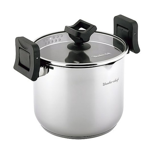 取っ手を持ち上げるだけでフタをロック。麺類はもちろん、茹で野菜などにも便利な湯切り機能。煮る・茹でる・蒸す、と幅広くご使用頂けます。200V電磁調理器を含むオール熱源対応。 |