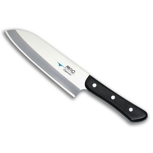 『真久作』スーペリアシリーズ三徳包丁は万能包丁とも呼ばれ、菜切包丁(和包丁)と牛刀(洋包丁)のそれぞれの特長を生かし、両方の利点を持つ包丁です。 |