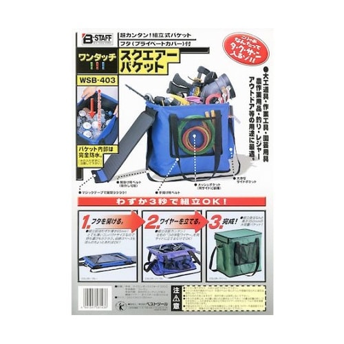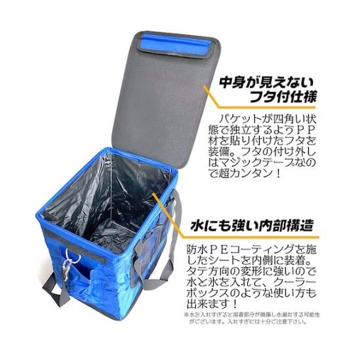 バケット内部は防水仕様のシートを使用しています。縦方向の変形に強いのでドリンク類などの簡易クーラーボックスとしても使用できます。 |