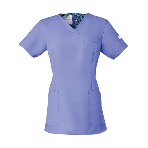 ワンピースのように「はいて着るスクラブ」きれいなシルエットが魅力フェミニンな花柄裏地▼背面の裏地に花柄の生地を使用。脱いだときや動いたときにチラリと見えるかわいいデザイン。