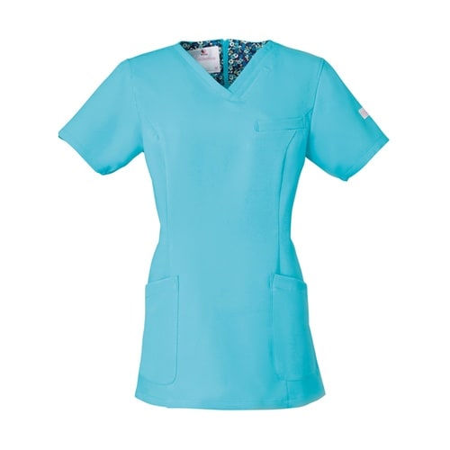 ワンピースのように「はいて着るスクラブ」きれいなシルエットが魅力フェミニンな花柄裏地▼背面の裏地に花柄の生地を使用。脱いだときや動いたときにチラリと見えるかわいいデザイン。